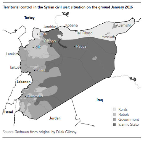 Naturally, the geopolitical position of a new and in many ways revolutionary social formation in the complex environment of the Syrian civil war is difficult to summarise concisely. It ranges from open battle with IS, enmity towards Turkey, and ambiguous relations with the FSA and the regime, to a tactical alliance with the US and, more recently, Russia. After Turkey shot down a Russian military jet over an alleged airspace violation in October 2015, reports of Russian diplomatic and military support for Syrian Kurdish forces emerged (Idiz 2016).