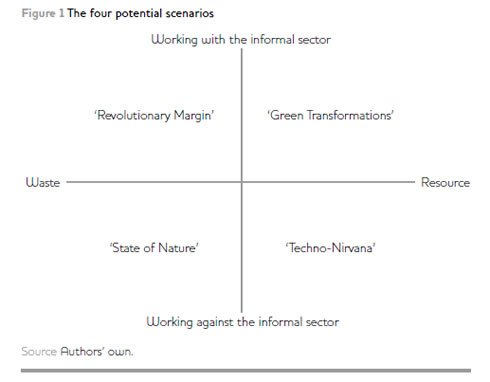 The second critical uncertainty in our framework is about the extent of involvement of the informal sector in managing urban waste. It is widely known that the informal sector plays a crucial role in management of MSW presently but government policies, particularly in India, favour formal 'end of pipe' solutions like waste to energy plants that are likely to limit access to waste for the informal sector (Schindler, Demaria and Pandit 2012: 18–19). Existing literature also suggests that informal sector operations have a net benefit in terms of economic, social and environmental impacts while formal waste management operations have a net cost (Ezeah, Fazakerley and Roberts 2013: 2514). The criticism of informal sector operations includes the health risks arising due to limited awareness or consideration for occupational health and safety by the informal sector (Ezeah et al. 2009). Informal sector workers and their families living near open dumps and landfills are highly susceptible to diseases and occupational health risks (Gutberlet and Baeder 2008: 1–5).