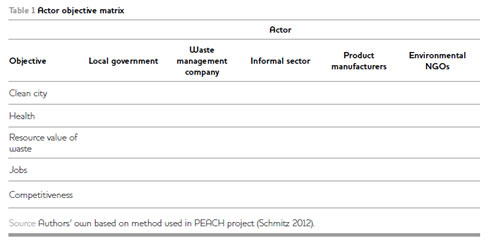 It is clear from Table 1 that the actors involved in waste management could have several, and different, objectives. Even if some actors have the same objectives, their priorities (rankings of the objectives) might differ. However, the critical task is to identify where and when actors whose priorities might be markedly different would come together and form alliances. For instance, the local government's highest priority is often a clean city. It could, however, ally with actors whose priorities might be different from its own as long as there is alignment over other objectives. The informal sector's highest priority may be protection of their jobs and livelihoods. The local government would form an alliance with the informal sector if, in addition to a clean city, it is also concerned about jobs in the local economy. However, if it is not concerned about jobs, but only about the resource value of waste, it might ally with the private formal sector whose top priority is likely to value recovery from waste.
