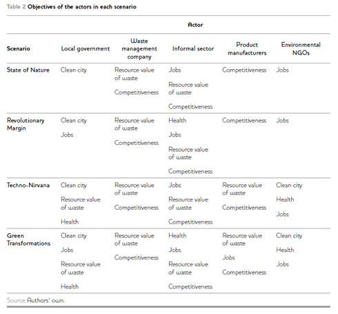 The discussion above suggests two defining characteristics of waste management in India. First, there are significant uncertainties about its future trajectories. We focus on the critical uncertainty related to the very conception of waste. Given the current scenario in India, it is not certain whether in the near future waste will continue to be dumped in landfills or whether it will be considered as a resource. Additional uncertainty is regarding the role of the informal sector. It is not clear whether the focus on privatisation of waste management will yield the desired results and lead to the further marginalisation of the informal sector, resulting in widespread loss of economic opportunities for the urban poor. The second defining characteristic of waste management in India is the presence of multiple actors who have several, and often conflicting, objectives. Understanding the complex interplay between the actors and their objectives and how they play out under different approaches (and technologies) is critical for designing and implementing effective interventions. The implication of such a diversity of actors and objectives is that the solid waste management sector is embedded in, and mediated by, a political framework with uneven power geometries, local political contexts and relations between stakeholders (Yates and Gutberlet 2011: 639). Consequently, these actors with their own conceptions of the future would like to influence developments in the sector such that they help meet their objectives.