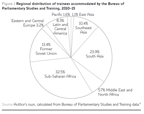 It is notable that numerous countries are the beneficiaries of Indian democracy promotion assistance. For example, during the period from 2010 to 2015, the Bureau of Parliamentary Studies and Training offered training and internship programmes for 566 participants from 87 countries. Sub-Saharan African countries (e.g. Kenya, Tanzania, Uganda, and South Africa) are the largest beneficiaries, followed by South Asian countries (e.g. Sri Lanka, Bangladesh, and Afghanistan), countries from the former Soviet Union (e.g. Belarus, Lithuania, Uzbekistan, and Ukraine) and Southeast Asian countries (e.g. Myanmar, Cambodia, Indonesia, and the Philippines) (see Figure 1).