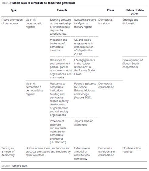 In general, as an external actor, a state can contribute to the enhancement of democratic governance in other countries in various ways (see Table 1). A state can cajole, prod, or even pressure authoritarian regimes into democratising, or it can mediate negotiation among conflict parties and thus facilitate democratic transition. After the transition, a state can facilitate democratic consolidation by assisting with institution-building and capacity development within various organisations, which is essential for democracy to function. There is an abundance of policy instruments available: a state can employ military intervention or economic sanctions, or extend development aid. Much less focused, but nonetheless an important contribution to the enhancement of democracy, are cases where a state serves as a model to garner interest and be studied and emulated by other countries.
