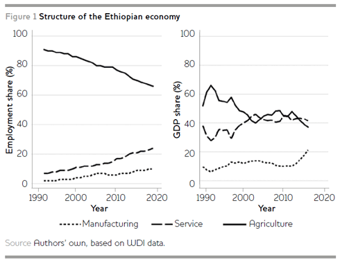Between 2005/06 and 2015/16, Ethiopia recorded a real gross domestic product (GDP) growth rate of 10.3 per cent (Moller 2015). During the same period, real agricultural output grew by approximately 8 per cent and the incidence of poverty declined from 43 per cent to 29.6 per cent (Bachewe et al. 2018). The growth in agricultural productivity was largely due to public investments in modern inputs such as improved seeds and fertiliser, extension services, and the development of agribusiness (ibid.). As shown in Figure 1, agriculture currently contributes roughly 37 per cent to GDP and 68 per cent to employment. Between 1991 and 2016, the sector’s contribution to GDP declined by 23 percentage points; however, despite this significant decline, its employment share remained high, a clear sign that the productivity of the sector is relatively low. Over the same period, the employment share of the manufacturing and service sectors increased by 8 percentage and 17 percentage points respectively.