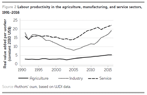Further breakdown of the overall labour productivity growth from 1991 to 2016 by the World Bank suggests that 17 per cent was due to structural change (labour mobility from agriculture to other sectors); 72 per cent was due to rising labour productivity in the agriculture, manufacturing, and service sectors; and 11 per cent was due to changes in the employment rate and demographic structures (Moller 2015). Overall, the results suggest evidence of both within- and between-sector productivity growth.