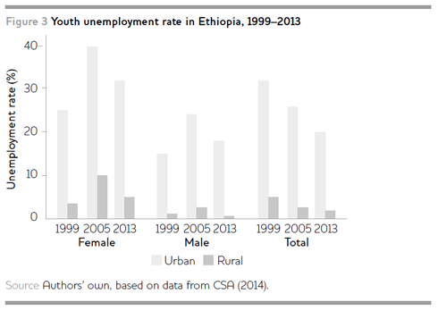 Youth unemployment is very high in urban areas and among women (see Figure 3). Between 1999 and 2013, the youth unemployment rate in urban areas declined from 32 per cent to approximately 20 per cent. In the same period, the rate in rural areas declined from 5 per cent to 3 per cent (CSA 2014). Like the general unemployment problem, youth unemployment is also an urban phenomenon. In addition to unemployment, underemployment is also a major challenge among youth;6 in fact, those employed in urban areas are mostly engaged in the informal sector. In 2013, 25.8 per cent of the urban employed individuals were in the informal sector, reduced from 50.6 per cent in 1999, and 38.5 per cent in 2005 (CSA 2014).