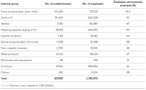 The data further suggest that from the 117,000 MSEs registered at the time, more than 70 per cent were engaged in activities directly related to the agricultural sector. In addition, 38 per cent of the employees in this sector were permanent paid workers while 22 per cent were in paid apprenticeships (CSA 2015c). Compared to small-scale enterprises, large- and medium-scale industries are largely ineffective in creating job opportunities (CSA 2015b). For example, in 2013/14, only 0.3 million individuals were employed by such industries. Thirty-nine per cent of these industries are in the agricultural sector (27 per cent in the food products and beverages sector and 12 per cent in the furniture industry), again suggesting the important role of agriculture-related activities.9