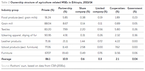 Table 2 presents the ownership structure of agriculture-related MSEs. More than 86 per cent of the small-scale industrial establishments are owned by private individuals, whereas government ownership is very limited. This suggests that the private sector is the major employer of individuals in the MSE sector. Another important driver of job creation is trade in agriculture-related activities: data from CSA (2014) suggest that a significant number of individuals – approximately 5.4 per cent of employed individuals in Ethiopia – are engaged in wholesale and retail trades, mostly for cereals. This rate is much higher in urban areas (20 per cent) compared to rural areas (2.9 per cent). This suggests that, as agricultural transformation intensifies, jobs can be created along the value chain.