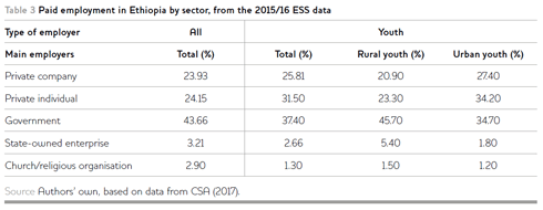 Despite the importance of the private sector in terms of job creation, the average wage paid by the private sector is much lower than public organisations. According to the ESS data, the average pay per hour in the government sector was 32 birr, whereas the rate in the private sector was 15 birr. However, public sector employees had a higher level of education; for example, 4.5 per cent of the youth employed in a paid government role had only a primary education qualification, whereas this rate was 41 per cent in the private sector.