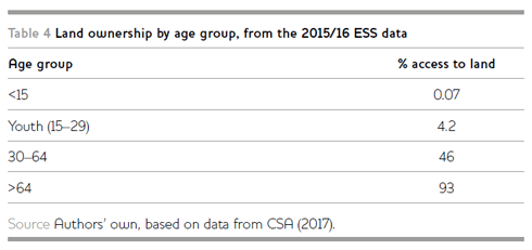 Finally, as the youth population is set to grow, and with 70 per cent of the youth living in rural areas, addressing key constraints, especially those related to land would be vital. Empirical evidence also suggests that landlessness among rural youth is increasing (Kosec et al. 2017; Bezu and Holden 2014). In fact, attracting youth into agribusiness requires addressing land-related constraints (AfDB 2016; Kosec et al. 2017; Bezu and Holden 2014). Even though Ethiopia’s land tenure and inheritance laws guarantee equal land acquisition and use rights for all rural citizens wishing to engage in agriculture, youth typically rely on inheritance and informal rental markets to access land (Kosec et al. 2017; Bezu and Holden 2014). However, the average farm sizes of smallholders have declined over the last decade and relying on inheritance is becoming less feasible. In fact, only 3 per cent of young women in Ethiopia have access to land (Bezu and Holden 2014). Due to limited formal land market opportunities, the youth can neither buy nor rent land on a long-term basis from other farmers. Therefore, there is a vital need to address land market-related constraints. In fact, previous studies (e.g. Bezu and Holden 2014) have suggested that young people in Ethiopia abandon agriculture due to limited access to agricultural land. Similarly, Kosec et al. (2017) documented that youth’s high expectation of land inheritance negatively affects rural–urban migration and employment in the non-agricultural sector. In particular, their results suggest that a 10 per cent increase in inheritance size reduces rural-to-urban migration and employment in the non-agricultural sector by 4.8 and 4.1 per cent respectively. Table 4 shows land ownership in Ethiopia by age group, based on the ESS data (CSA 2017). The data show that only 4.2 per cent of the youth own land. Therefore, institutional arrangements and land market reforms that improve youth’s access to land are crucial, if youth are to be the drivers of agribusiness.