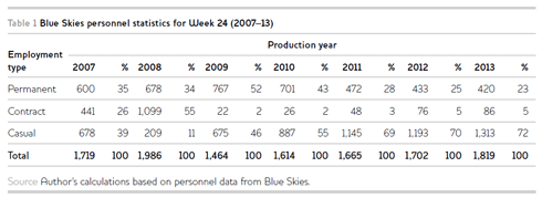 The structure of the article is as follows: Section 3 provides a conceptual perspective on labour casualisation and Section 4 gives a brief description of Blue Skies, including the historical and macroeconomic context of its growth. This material is then reviewed briefly in Section 5 to draw out insights relating to the private sector’s role in job creation, and the role of government policy frameworks that enabled the company to launch and grow. This is followed by a discussion in Section 6 of specific vulnerabilities Blue Skies was exposed to and its response, and also an analysis of its employment trends and patterns. Section 7 concludes by emphasising lessons and policy insights from the case.