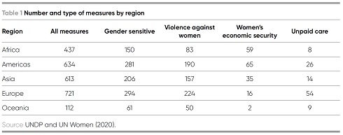 Most countries are failing to adequately protect women and girls’ rights during the pandemic (UNDP and UN Women 2020). The new United Nations Development Programme (UNDP)-UN Women Covid-19 Global Gender Response Tracker registers about 2,500 policy measures implemented by 206 governments around the world to address the gender-specific impact of Covid-19. It collates information on national measures that directly address women’s economic and social security needs – including those that address unpaid care work and violence against women and girls; and measures to sustain participation and access to labour markets (Table 1).