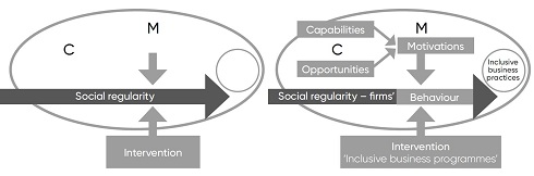 To get closer to the actual mechanisms that generate change, a realist approach to impact evaluation of inclusive business programmes can opt to zoom in on choice-making and behavioural processes that generate changes in the form and substance of decision-making (Westhorp 2012, 2013) and subsequently refashion the practices and rules of individual firms or networks of firms. Following the conceptualisation of Michie, van Stralen and West (2011) and Mayne (2019b [2016]), firms or other organisational actors need to have the Capacities, the Opportunities, and the Motivations to make the Behaviour change (the COM-B model). Experiences with the new behaviour feed back into and change the capacities, opportunities, and motivations, as part of a structuration process where structures are reproduced and changed through agency (Giddens 1984). Inclusive business programmes have interventions and activities that aim to influence ongoing social processes (social regularity) by triggering the motivation of firms (mechanisms) to change their business models (behaviour) in a way that markets become better, fairer, and more inclusive (outcome pattern).