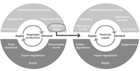 Take, for example, agricultural production. The supporting functions and rules affecting supply include input supply, labour availability, and agricultural information. For demand, relevant supporting functions and rules might include marketing and informal norms around consumption behaviours; while for exchange, important supporting functions and rules might include infrastructure provision, market information, and export regulations.
