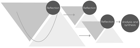 We had initially planned that our contribution analysis framework would follow what might be referred to as a ‘linear spiral’ of ongoing evaluative activity, with our top-down and bottom-up lenses forming discrete phases of research, followed by a period of reflection and analysis. However, one of our key findings was that the reality of our evaluation implementation was much more iterative and ‘messier’ in reality, as illustrated in Figure 4. For example, we found that our understanding of the market systems in which our interventions operated continued to evolve during the bottom-up data collection phase – as we learned more about context and the roles and responsibilities of key actors, for instance – and this necessitated further top-down research activities and periods of reflection.