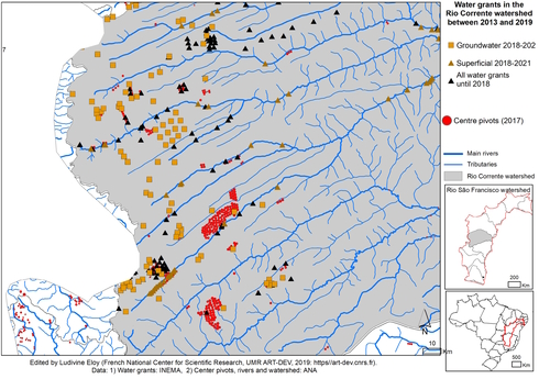 The projection of water grants and irrigation data in the basin shows the spatiality of local mechanisms of water grabbing in the area. In the context of increasing environmental and land conflicts in Matopiba (CPT 2019; Favareto 2019), changes in the hydrological cycle associated with the spatial dynamics of agro‑industrial frontiers help explain large-scale water governance problems and water conflicts.