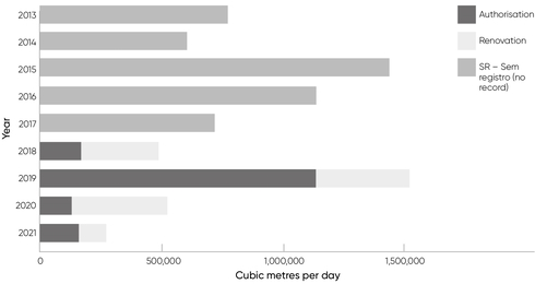 Figure 2 Water grants (cubic metres/day) approved by INEMA in the Rio Corrente River Basin between 2013 and 2021